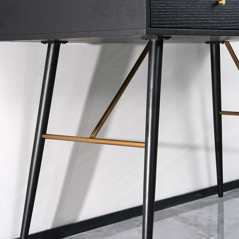 材质:MDF贴黑橡直纹木皮桌身,黑色哑光喷粉铁脚&不锈钢拉丝镀金色连接杆,铜拉手